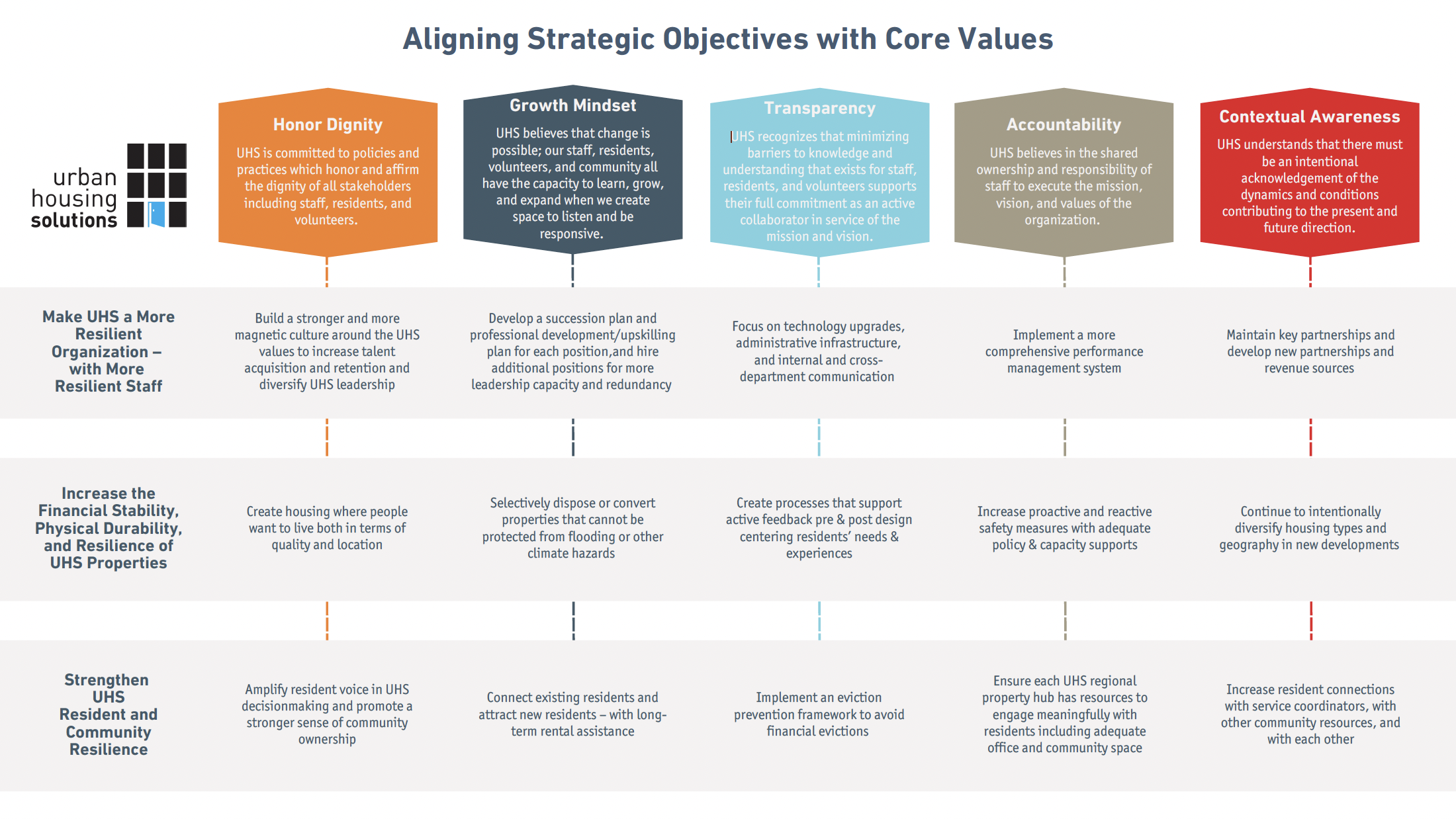 Urban Housing Solutions sought a strategic plan to align its affordable housing and social services with a cohesive, community-driven vision. WOCC engaged over 130 stakeholders in developing a values framework, guiding operational changes, and supporting pilot programs to help UHS connect mission to daily practice and build a more cohesive, values-centered organization.