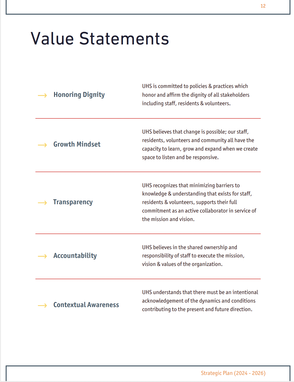 WOCC partnered with UHS to lead a holistic, equity-grounded strategic planning process. Over several months, we engaged more than 130 staff, residents, and partners through 1:1 interviews, focus groups, and interactive workshops. This process produced a custom values framework to guide both internal culture and external relationships, ensuring that every decision and partnership aligned with the organization’s mission and principles.